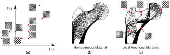 The effect of microscopic property variation for trabecular architecture using perimeter control. (a) Microstructure library for different macroscopic properties and represents axial and shear properties, respectively, (b) reference design using homogeneous material, and (c) a sample design using local functional materials with different macroscopic properties.
