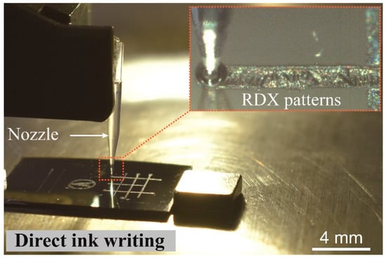 Many printing methods have been used to generate micro-patterns for the deposition of conductive, ferromagnetic, piezoelectric, and energetic materials [,,,]. Those functional patterns can be designed and printed directly from electronic designed files without the need for a mask or a mold. However, the printing of energetic materials from an all-liquid ink to create micro-patterns is generally difficult because the typical solvent used in the ink and the solid crystals can cause malfunctions in the printing head and clog the nozzle, respectively. That the low surface tension of the ink, which is caused by the solvent used in the ink, limits printability is another disadvantage.