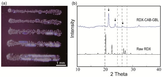 The RDX crystals were observed using a stereomicroscope (JSZ-7XB/7XT, Samwon, Seoul, Korea). The crystal morphologies of the printed samples were obtained using field emission scanning electron microscopy (FE-SEM) (JSM-7100F, JEOL Ltd., Tokyo, Japan). X-ray diffraction (XRD) was used to characterize the crystal structure of the RDX in the printed samples. The printed RDX patterns were characterized using an UltimaIV X-ray diffractometer, and the drop-casted RDX was characterized using a Rigaku diffractometer. Silicon substrates were used for the XRD characterization and were placed in the equipment’s sample holder “as-printed”.