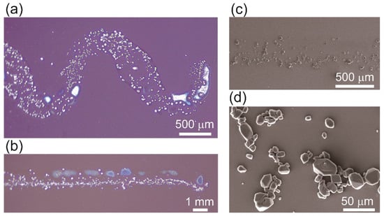 When RDX patterns were printed on pristine Si wafers at a printing speed of 0.5 mm/s (Figure 3a–c), the printed micro-patterns were observed to have mostly an interesting single crystal structure of several individual or assembled crystals with sizes ranging from 3 µm to 40 µm distributed along the patterned lines (Figure 3c,d). This occurred because the lower surface energy of the untreated Si wafer was unfavorable for spreading. Furthermore, when an RDX ink is used to print a pattern on the surface of a pristine Si wafer, obtaining a pattern with good resolution is somehow difficult, as shown in Figure 2a and Figure 3a,b. Moreover, the distribution of the single crystals is inhomogeneous; as a result, some patterns have a disconnected appearance. Because these issues are caused by the low surface energy of the pristine Si wafer, we used RDX ink to print patterns on UVO-treated Si wafers and observed the differences.