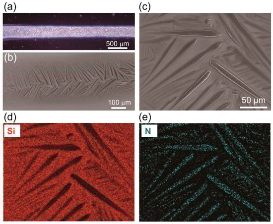 We printed RDX patterns on the UVO-treated surfaces of the Si wafers, which are highly hydrophilic surfaces, and observed that the crystal morphology of the RDX particles was dendritic (Figure 4a,b). Long and smooth branches ranging in length from 70 µm to 122 µm were generated from the outer line of the RDX pattern toward the middle of the pattern, with most of the short branches being formed at the periphery (Figure 4b,c). Energy dispersive spectroscopy (EDS) confirmed the presence of elemental nitrogen from the RDX material in the crystalized printed patterns (Figure 4d,e). Based on these results, we infer that the orientation of the dendritic crystal structure formed on the UVO-treated surface is affected by the higher surface energy of that surface. Moreover, at a slower speed, more ink can be dispensed, allowing the growth of bigger crystals. In summary, printing RDX ink on the treated surface of a Si wafer provided better printability and allowed long and connected crystalized micro-patterns to be formed.