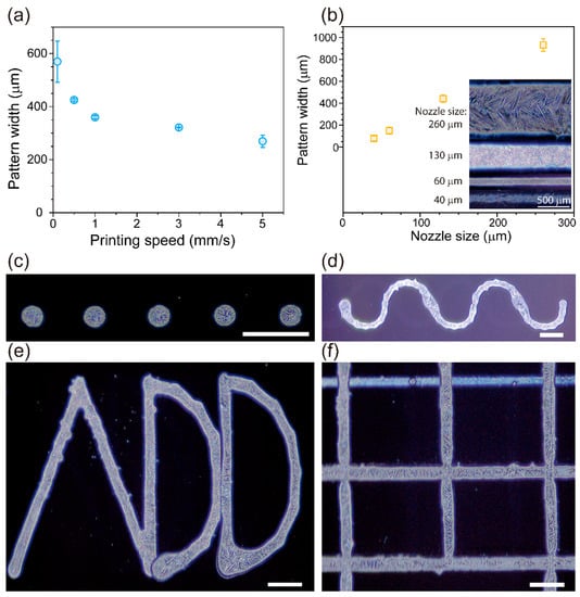 Widths of RDX patterns printed on the surfaces of UVO-treated Si wafers (a) at different speeds and (b) with different nozzle sizes (inner diameters). The inset of (b) shows representative RDX patterns printed by using various nozzle sizes from 40 μm to 260 μm. Various printed RDX patterns with different shapes were realized: (c) dot, (d) wavy, (e) alphabetic “ADD”, and (f) grid. They were printed on the UVO-treated surfaces of Si wafers. Scale bar = 500 μm.