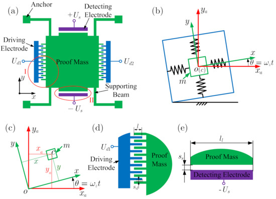 Figure 1 gives a model of a micro-machined gyroscope. Figure 1a shows the schematic representation of the micro-gyroscope, and Figure 1b shows the equivalent spring-mass model. In Figure 1b, m is the proof mass of the sensitive structure. is the inertial coordinate system, and is the driving/detecting coordinate system of the micro-machined gyroscope. The origin o is located at the center of the proof mass, as the system is in static balance, as shown in Figure 1b. x is the driving direction, y is the detecting direction, and z is the direction of vertical paper facing outwards. is the angular displacement of the gyroscope around the z-axis, and is the angular velocity being measured. As mentioned in Ref. [34], the angular velocity is assumed to be constant. Therefore, Euler’s second law of motion can be omitted in the considerations. Based on the relations between the displacements of the driving/detecting coordinate system and the inertial coordinate system shown in Figure 1c, the displacements of the proof mass in the inertial coordinate system can be given as