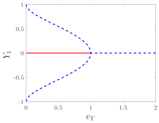 The above equation is an algebraic equation about . Its solutions may bifurcate when parameters such as and are varied, since it is nonlinear. In this section, we have conducted a bifurcation analysis of Equation (32). For simplicity, in Equation (32) is regarded as the bifurcation parameter, and is fixed in the following discussion.
