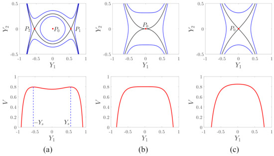 Here, is the center, and the other two equilibriums are saddle points. In order to deeply understand the dynamics of Equation (13), the potential energy function and the Hamiltonian function can be obtained as