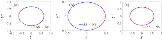 Comparisons between the analytical solutions and the numerical solutions; (a) , , and , (b) , and , and (c) , , and . AS: analytical solutions, NS: numerical solutions.