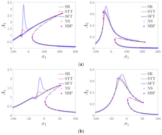 Comparisons between the solutions based on the residue theorem and Taylor expansion; (a) and and (b) , and . SR: solutions based on the residue theorem, STT: solutions based on the third-order Taylor expansion, SFT: solutions based on the fifth-order Taylor expansion, NS: numerical solutions, SBP: the saddle-node bifurcation point.