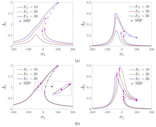 where , and is the Jacobian matrix of the periodic response. The expressions of its elements are given in the Appendix A. The stability of the steady-state solutions can be determined by the eigenvalues of . The steady solution is stable if and only if the real part of all eigenvalues is negative. A positive real part of the eigenvalue leads to unstable solutions. The steady solution loses its stability as one real eigenvalue changes its sign, and the saddle–node bifurcation occurs. A pair of complex conjugate eigenvalues passing the imaginary axis of the complex plane at the bifurcation point leads to Hopf bifurcation [37].