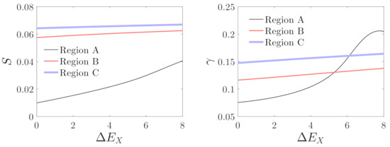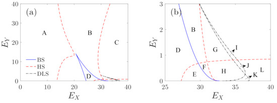 Then, the singularity theory [30,38] is employed to analyze the effects of and on the bifurcation characteristics of Equation (32). The transition sets of Equation (32) are defined as , where denote the bifurcation sets, the hysteresis sets, and the double limit point sets, respectively. Their expressions are given in Table 1.