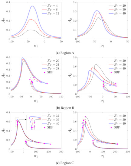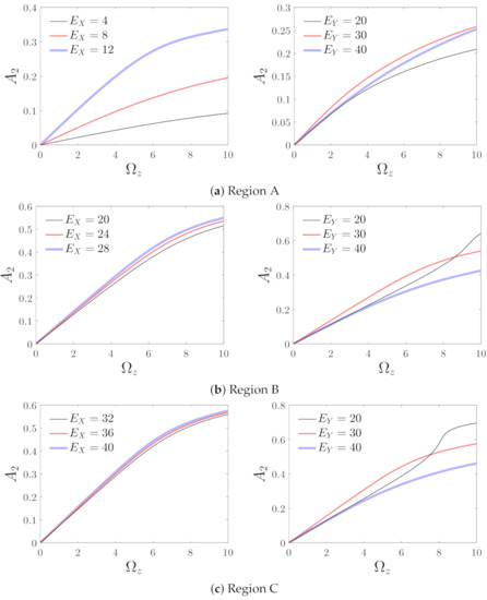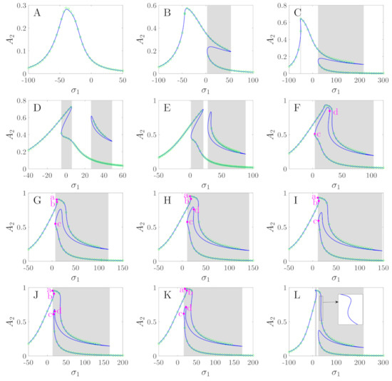 Micro-machined gyroscopes are not suitable for operation in multi-solution areas because the response may jump to other solutions, which may result in the gyroscope producing an incorrect output, as the system is disturbed. Figure 9 shows the multi-solution regions of the bifurcation curves, which are marked by the shaded areas. It can be seen in subplots D through L that most of the peak parts of the resonance curves are near multi-solution areas; thus, they do not meet the working requirements of the gyroscope. Only the bifurcation curves of regions A through C have large single-solution areas near the peak parts. Thus, in the following, we focus on the analysis of the response characteristics in regions A through C.