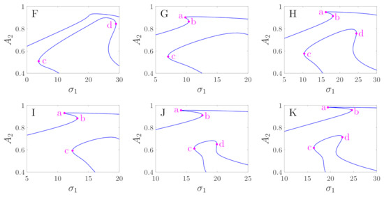 In order to explain the differences in the bifurcation diagrams corresponding to regions F through K, we defined four key points as points a through d. They are all turning points of the bifurcation curves, as shown in Figure 9. Figure 10 shows the partial enlargements of the bifurcation curves. We can see in the bifurcation diagram of region F that points a and b do not exist. However, corresponding to regions G and I, point d does not exist. The differences in G and I are that point c in the curves of region G is on the left side of point a, and point c in the curves of region I is between a and b. Corresponding to regions H, J, and K, points a through d all exist, while in the curves of J, point c is between a and b, and the curves of regions H and K are to the left of point a. In region K, point d is between a and b, and point d of regions J and H is on the right of point b. The different positions of these turning points may cause different jumping phenomena as the driving frequency is increased or decreased. Figure 9 also gives the comparisons between the numerical solutions and the analytical solutions. It can be seen that the numerical solutions are in good agreement with the analytical solutions, except for the case in which the value of is large. This is because in the calculation of Equation (32), we set , but actually, .