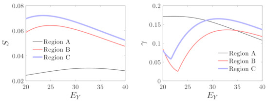 Variations in the detecting amplitude with the measured angular velocity corresponding to different parameter regions; Region A: , Region B: , and Region C: .