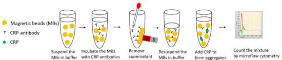Figure 2 displays a schematic illustration of the MCIA for CRP detection. The whole immunoassay was divided into three steps. Antibody coupling was the first step. Dynabeads M-270 Epoxy (Thermo Fisher Scientific,Waltham, MA, USA) magnetic beads (MBs) were coated with anti-CRP antibodies (PA1-29087, Thermo Fisher Scientific, USA) according to the user manual. The coated MBs were kept at 4–8 ℃ over a duration of one month while being preserved in sodium azide. The second step was to form aggregates. The coated MBs were diluted by phosphate buffered saline (PBS) to 20 µL with a final bead concentration of 1.0 × 107 beads/mL. The diluted 20 µL MBs solution was mixed with 20 µL of CRP (Sekisui Diagnostics, Burlington, MA, USA) with gentle shaking or mixing with a pipette for 10 s. The mixture was incubated for 4 min., and aggregates formed during this process. This step can be manually performed in a centrifuge tube. PBS was used as a negative control. The final step was the detection of aggregates by the microflow cytometry. The resulting mixture was transferred from the microcentrifuge tube into the sample syringe pump for detection by the microflow cytometry. The sample flow rate and the sheath flow rate were set at 200 µL/hour and 800 µL/hour, respectively. Four min of raw data from side scattering (SSC) light signals were collected for analysis.