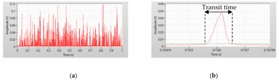 Figure 3a shows one second of data from a 0.50 µg/mL CRP test, which were recorded by a custom LabView program. The x-axis is the time in milliseconds and the y-axis is the amplitude of the pulses produced when the reaction mixtures pass through the interrogation region. Distinguishing between different sizes of aggregates using scattering light intensity is impossible, because the non-spherical nature of the aggregates can cause a wide scattering light intensity distribution and an irregular increase of intensity. Transit time was employed to solve this problem. In Figure 3b, the red solid line is the side scattering signal when one particle passes through the interrogation region, which is referred to as a count. The green dashed line is the threshold value that is the standard deviation of the background noise. The threshold was used to distinguish effective counts from noise. The interval between the intercepts of the threshold and the pulse is defined as the transit time.