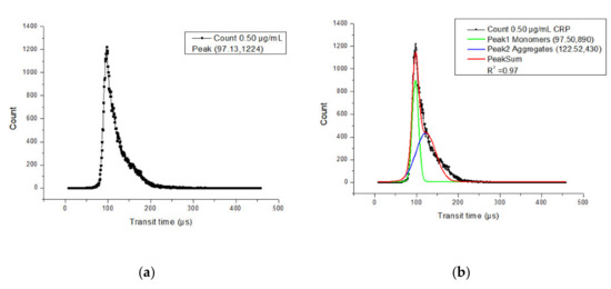 Most of the single beads have a transit time around 97 µs, as shown in Figure 4a. The distribution of the transit time between monomers and aggregates can be separated by Gaussian fitting, which is shown in Figure 4b. By the observation of aggregates through a microscope (Eclipse E200, Nikon, Mississauga, ON, Canada), most of the aggregates were dimers, so the number of peaks for Gaussian fitting was set as 2. The green solid line is the monomer distribution, which has a peak transit time of 97.5 µs, while the red solid line is the aggregate distribution, which has a peak transit time of 122.52 µs. The difference between these two peaks is 25.02 µs. Three 0.5 µg/mL CRP samples were tested and the difference in transit time was 25.00 ± 0.11 µs. The mean value of the difference is close to the theoretical calculation value of 25.20 µs. Although the transit times of both monomers and dimers during the experiment were smaller than the estimated theoretical calculations, the difference between experimental results and theoretical calculations is small. This means that the microflow cytometry is sensitive enough to discriminate between monomers and dimers by the transit time. The shorter transit time during the experiment may have been caused by a small cross-sectional area. When the cross-sectional area of the microchannel is smaller than 50 µm × 100 µm, the velocity of the particles in the channel will be larger, which causes the transit time to be less than the theoretical calculation. If the beam waist in the microchannel is smaller than 10 µm, the detected transit time will be less than calculated.
