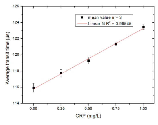 The relationship between the average transit time and CRP detected by the MCIA. Phosphate buffered saline (PBS) was used as the negative control. Each square and error bar were the mean value and standard deviation, respectively, of three parallel measurements.