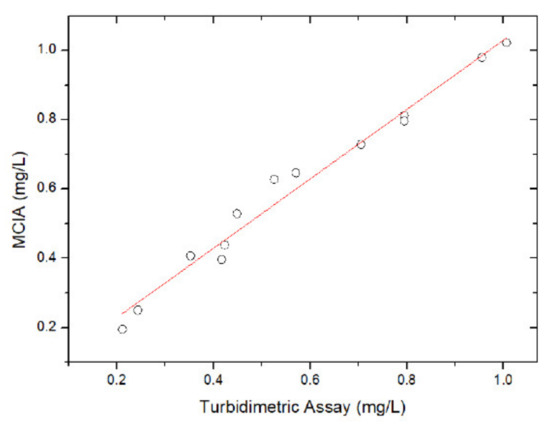 The accuracy of MCIA was validated by assaying the same CRP samples by the MCIA and a turbidimetric immunoassay (Beckman DU 800 UV/Visible Spectrophotometer, Beckman Coulter Inc., Fullerton, California, USA). Figure 6 shows the correlation between the CRP concentration that was measured by the MCIA method and the conventional turbidimetric assay. A correlation coefficient r as high as 0.98 is achieved, which implies that accurate CRP concentration measurement can be achieved by the MCIA, as shown in Figure 6.