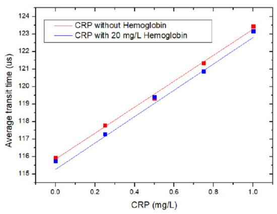 Hemolysis is one of the most prevalent pre-analytical interferences and a main source of error during clinical tests [19]. The release of hemoglobin caused by hemolysis can contaminate serum samples. Hemoglobin (H7379, Millipore-Sigma, Oakville, ON, Canada) was added to CRP samples with a final concentration of 20 mg/L to test the interference of hemoglobin to CRP tests. Each sample was tested by the MCIA three times according to the procedure shown in Figure 5. The x-axis indicates the concentration of CRP, and the y-axis is the average transit time, as shown in Figure 7. The square block is the mean value of three parallel samples for each group. The red curve presents the transit times for CRP samples without hemoglobin and the blue curve shows the transit times for CRP tests with hemoglobin added. SPSS software (IBM) was used in order to compare slopes and intercepts of these two regression curves. The critical value was set as 0.05. The calculated p-value for the slope and intercept are 0.908 and 0.07, respectively. Both p-values are larger than 0.05, which suggests that there is no significant difference between these two curves and the interference of hemoglobin to CRP tests is acceptable.