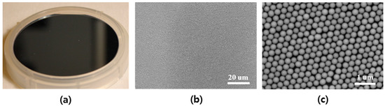 (a) Spin-coated 2-inch round Si surface, (b) SEM image of uniformly distributed Si nanospheres (SNSs), and (c) SEM image of closely-packed 2-dimensional (2-D) SNSs.