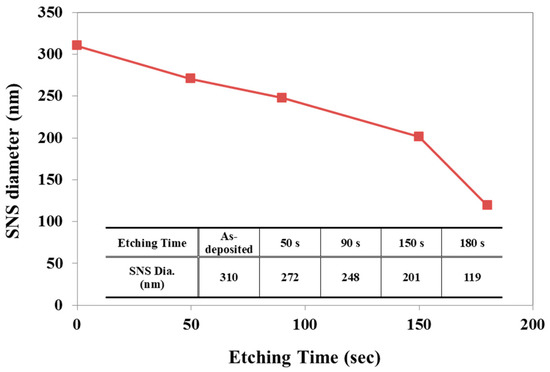 However, with 180 s of etching, a rapid increase of the ER was measured. From the SEM images in Figure 3, it can be seen that SNS size reduction occurred in both lateral and vertical directions, but vertical direction etching was more dominant and this originated from the anisotropic etching property with accelerated ion bombardment during RIE. Therefore, with excess etching times, the vertical thickness of SNS would become very thin, causing rapid ER acceleration in the lateral direction of SNSs.