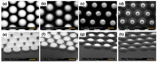 Top (a–d) and 25°-tilted (e–h) SEM images of SNSs after CHF3/Ar gases etching with four different etching times: (a,e) 50 s, (b,f) 90 s, (c,g) 150 s, and (d,h) 180 s.