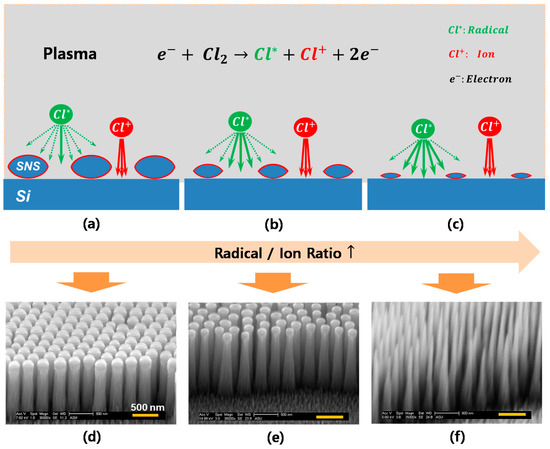 This top diameter mismatch from the initial mask size can be explained by the (1) effective SNS mask area and (2) radical/ion flux ratio. Regarding the effective SNS mask area, as mentioned in Section 3.2.1, in SNS mask etching during CHF3/Ar RIE, the vertical-direction etching was more dominant than that in the lateral direction. As a consequence, the thickness of the mask became even thinner compared with the length of lateral mask size as etching time increased (Figure S1). Therefore, with longer etching times, the effective SNS mask area (orange solid circle in Figure S1) was reduced because little SNS remained at the edge region leads to less etching protection for the Si surface under the edge area of the mask compared with the core SNS region. The second aspect influencing the mismatch is the radical/ion flux ratio change with different mask sizes. Basically, RIE is an etching process that involves two etching species: (1) radical for chemical isotropic etching and (2) ion for physical anisotropic etching. With the Cl2 gas RIE process, the Cl2 molecules are dissociated into reactive neutral species, radicals, and positively charged particles (ions). The radicals react chemically with the Si surface, producing etching by-product (i.e., SiClx), and ions collide with the Si surface and physically remove the by-product. However, as schematically shown in Figure 4, the radicals have a large angular distribution (AD) because of their neutral property, but ions move to the Si surface with a highly narrow AD because the charged ions are accelerated by applied bias [35]. Therefore, with a large SNS mask size (Figure 4a,b), ion-dominant vertical etching occurs and the lateral diameter of the Si NP is maintained with no significant changes (Figure 4d,e). However, with a small mask size, a higher radical/ion flux ratio will flow between the SNSs to etch the Si surface (Figure 4c), which offers more isotropic chemical etching followed by a reduced top diameter of the Si NPs from the initial mask size and resulting in Si NT fabrication (Figure 4f).