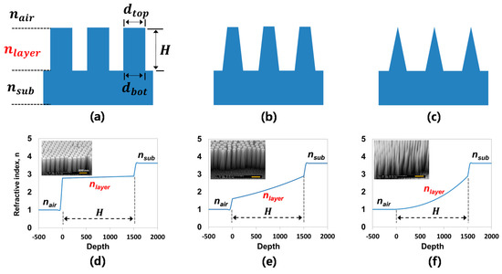 SEM images of (a) dtop = dbottom, (b) dtop < dbottom, and (c) dtop << dbottom of nanostructures and (d–f) degree of refractive index change along with each nanostructured layer (Note: scale bar is 500 nm in SEM images).