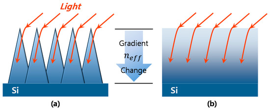 Unlike the NP structures (Figure 5a,b) that had abrupt refractive index changes in the layers (Figure 5d,e), the well-sharpened NT structure (Figure 5c) provides a gradient refractive index change along the Si NT layer, as schematically illustrated in Figure 6. This Si NT layer acts like multiply coated AR layers that can provide highly effective suppression of broadband surface reflection [39,40].