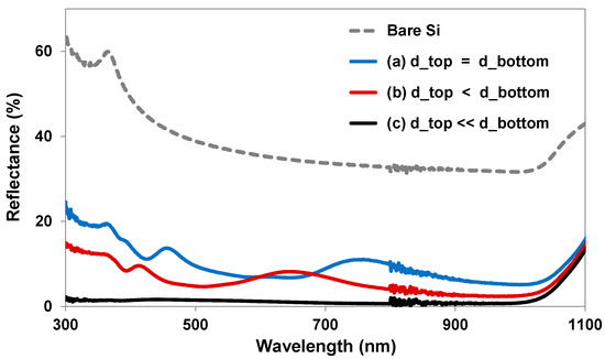 The results of measured surface reflection (Figure 7) confirm that the Si NT layer (dtop << dbot) had greatly reduced surface reflection compared with the other nanostructured layers (dtop = dbot and dtop < dbot). By calculation of the weighted reflectance (Rw) from the measured reflectance in the 300 nm to 1100 nm wavelength range, the Si NTs had only a 1.3% Rw, which is a significantly reduced value from 5.7% (dtop < dbot) and 8.9% (dtop = dbot).