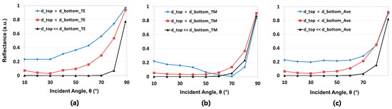 We also performed computational optical analysis with a rigorous coupled-wave analysis (RCWA) method, which is known as a highly accurate computational optical modeling technique for periodically arrayed nano-/micro-structures [41]. From our computational work, well-tapered Si NPs revealed greatly reduced surface reflection even with a large incident light angle for polarized light in both transverse electric (TE) and transverse magnetic (TM) modes. The computational analyses were performed with various incident angles (10°~89°) and 45° fixed azimuth angle at 600 nm wavelength for fabricated nanostructures (Figure 8). From the modeling, we found that decreased dtop provided less incident angle dependency for light reflection This is because, as shown in Figure 8a,b, larger diameter variation between dtop and dbot reduced the reflection sensitivity for light in both the TE and TM modes owing to more effective refractive index change and highly randomized electron oscillation on the surface [7,42]. Consequently, the averaged reflection of TE and TM modes was effectively suppressed even at a large incident light angles, as shown in Figure 8c. Note that for RCWA modeling, the diffraction order was set up to 5th, but the reflectance was mostly made by 0th order because the period of the nanostructure was smaller than the used spectral range of 300~1100 nm.