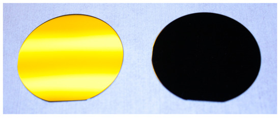 From images (Figure 9) of our Si-NT-fabricated Si sample (2-inch dia. wafer, right side) and the plain Si surface (left side), it can be clearly seen that the Si-NT-structured Si surface produced barely any surface reflection and revealed the “black-Si” feature [43].