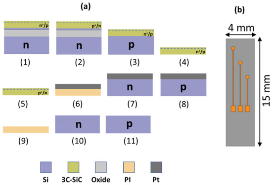 Samples fabricated for the MRI experiments. (a) Sample cross section for image artifact analysis. Sample number (1) through (11) correspond to those of Section 2.1. Si (silicon), 3C-SiC (cubic SiC), PI (polyimide), and Pt (platinum) were the materials used as shown. (b) Top view of the three electrode test devices (4, 6, and 8 mm long) used for SAR analysis for reference.