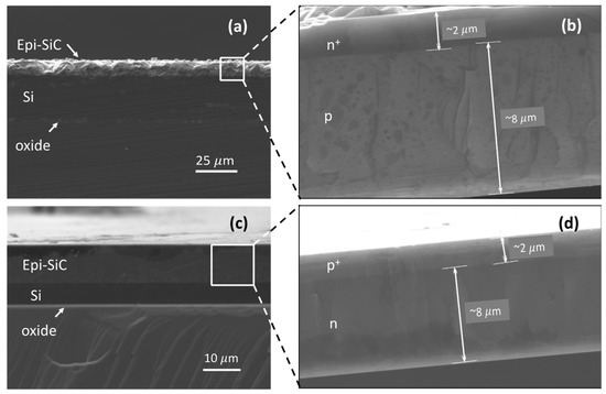 Cross section SEM micrographs of the 3C-SiC samples. (a) Cross section view of the n+/p 3C-SiC on SOI substrate. (b) Free-standing n+/p sample after etching oxide in HF and Si in KOH solution. (c) Cross section view of the p+/n 3C-SiC on SOI substrate. (d) Free-standing p+/n sample.