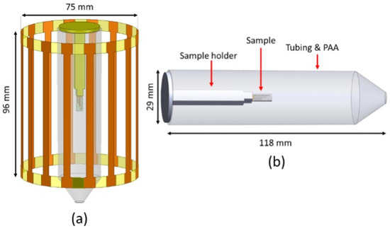 ANSYS HFSS (19.2, Ansys, Inc., Canonsburg, PA) was used to perform the FEM electromagnetic simulations. For simulation purposes, a 16-leg high-pass birdcage resonator of 75 mm diameter and 96 mm length was designed and tuned at ~300 MHz in HFSS. An auto-open region radiation boundary condition was chosen to surround the birdcage resonator. Although we are aware that this boundary condition might result in a slight overestimation of the simulated B1 field due to RF shielding within the bore in MRI scanners [50], we believe this will not change the qualitative results presented here. During experiments (discussed later) the Pt and 3C-SiC samples (Figure 1b,c) were placed inside a tube and fixed in-place using a 3D printed polyacrylic acid (PLA) holder. The tube was filled with the saline gel phantom, and this sample holder was modelled in ANSYS HFSS (Figure 3). The EM simulation was set to have a convergence criterion of , when solving for Maxwell’s equations [9]. The simulations were run on 24 CPU cores (2x Intel® Xeon® CPU E5-2650 v4 @ 2.20GHz with 5 × 64 GB of RAM) within the USF research computing center.