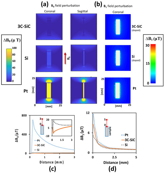 Fortunately, the influence of these two phenomena can easily be separated via numerical simulations. The simulations can then be compared to MRI experimental data for a better understanding of the composite interactions involved. Fourier-based simulations estimating B0 field perturbation due to , and EM simulations estimating B1 field perturbation, are shown in Figure 5. The results indicate a shift in the B0 field, as well as a B1 field perturbation, surrounding the samples. As expected, regarding the value of for 3C-SiC compared to Pt and Si, the 3C-SiC sample displayed a lower amount of B0 field shift surrounding the sample while Pt displayed the highest. Figure 5c shows B0 along the line extending from the sample midpoint of the top edge to 3 mm away from the 3C-SiC, Pt, and Si samples. As shown, B0 caused by the 3C-SiC sample is nearly zero, while the Pt and Si samples show higher B0 values along this path. Figure 5d also shows B1 along the same path up to 5 mm away from the sample.