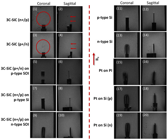MRI experimental scan images indicating the intensity of the image artifacts in the samples previously simulated. B0 field direction shown by arrow in figure. (1) Coronal view of free-standing 3C-SiC (n+/p). As seen, this thin sample (~10 µm) was almost invisible in the scans. This is also true for the sagittal view of the similar sample (2). (3,4) 3C-SiC sample (n+/p) did not display any footprint in the scans. Image artifacts were minimum for all 3C-SiC samples grown on p-type Si substrates (5–8). However, all of these samples were visible in the MRI scans when the Si substrate remained on the sample. On the other hand, 3C-SiC on n-type Si created image artifacts when the Si substrate remained on the sample (9,10). Opposite to the p-type Si substrate (11,12) that did not show any image artifacts, the n-type Si substrate generated comparatively high image artifacts (13,14). Pt showed severe image artifacts, regardless of the substrate used (15–20). All experiments for 7T MRI.