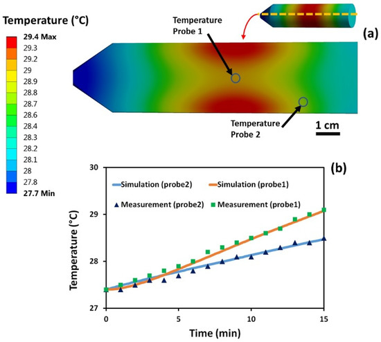 Measured and simulated gel phantom temperature rise without any samples present. (a) Cross section view of the sample tube simulated temperature profile after 15 min of exposure to ~300 MHz RF field excitation. (b) Measured and simulated temperature profiles at probe 1 (probe tip) and probe 2 (tissue phantom) locations. Initial temperature was 27.4 °C, and after 15 min exposure to MRI scan, it increased to 29.1 °C at the probe 1 location and to 28.5 °C at the probe 2 location. Estimated FEM value at the probe 1 location was 29.08 °C and at the probe 2 location 28.47 °C, which is in a very good agreement with experimental results.