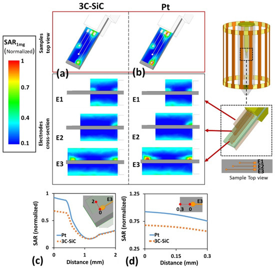 As seen in Figure 8, the simulated results indicated a meaningful difference in the SAR distribution between the Pt and 3C-SiC samples. The simulations predicted a ~30% lower maximum SAR1mg for 3C-SiC comparing to Pt. Although both samples experienced very low amounts of SAR, in the case of a longer electrode, it is believed that this difference would be more evident.