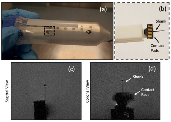 Experimental details for the fabricated all-SiC probe under 7 T MRI scanning. The same MRI sequence for image artifact analysis was used. (a) Photograph of the experimental setup consisting of the PLA holder, the plastic tube, the saline gel phantom, and a functional all-SiC neural probe. (b) A close-up image of the all-SiC neural probe glued on the PLA holder. (c) Sagittal view of the probe showing a slight circular image artifact. (d) Coronal view of the probe. The shank generated less image artifacts than the metallic pads, as expected, which would be outside of the brain during probe use.