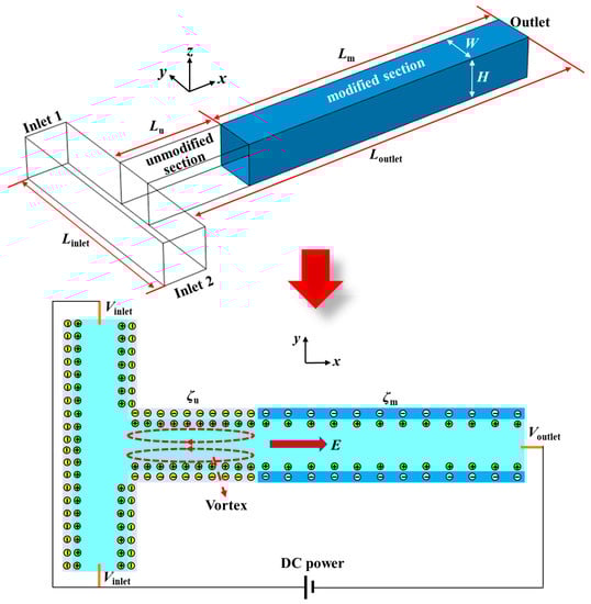 Figure 1 displays the structure and working principle of the proposed micromixer. The structure of the micromixer is a T-type microchannel with one outlet and two inlets. The lengths of the inlet and outlet channels are Linlet and Loutlet, and the width and height of the channel are equal, namely, W = H. In this study, the dimensionless lengths of the inlet and outlet channels were set to be 10 and 30, respectively, and the characteristic length is Lref = 10 μm. The outlet channel is divided into an unmodified section and a modified section. The lengths of the unmodified section and the modified section are Lu and Lm, and the parameter of β = Lm/Lu is defined as the length ratio of the modified section to the unmodified section. Two different DC voltages of Vinlet and Voutlet are applied at the two inlets and the outlet of the microchannel. The walls of the inlet channel and the unmodified section of the outlet channel have the same negative zeta potential (ζu), and the negative zeta potential (ζm) of the modified section is designed with a smaller absolute value. The parameter of α = ζm/ζu is defined as the zeta potential ratio of the modified section to the unmodified section.