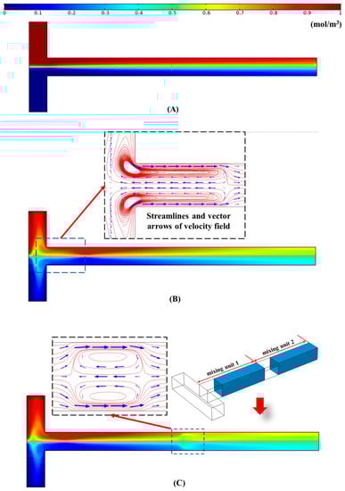 Distribution of the concentration field on the center cut plane of the microchannel under different cases: (A) The channel wall has uniform zeta potential (−50 mV); (B) the channel wall has non-uniform zeta potential (one mixing unit: ζu = −50 mV, α = 0.1, β = 6); (C) the channel wall has non-uniform zeta potential (two mixing units: ζu = −50 mV, α = 0.1, β = 6).