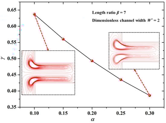 The dependence of the zeta potential ratio (α) on the mixing index (γ) is shown in Figure 3 under the conditions of the length ratio β = 7 and the dimensionless channel width W* = 2 (W* = W/Lref, Lref = 10 μm). It is clear in Figure 3 that the mixing index (γ) of the solute declines with the increase of the zeta potential ratio (α) of the modified section to the unmodified section. It could be explained as follows: