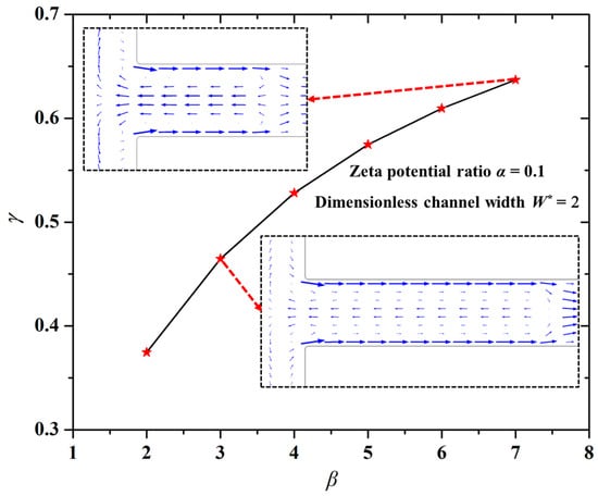 Figure 4 shows the changing trend of the mixing index (γ) with the length ratio (β) of the modified section to the unmodified section. The other parameters were set to be the zeta potential ratio α = 0.1 and the dimensionless channel width W* = 2. One can easily see in Figure 4 that the larger the value β, the higher the mixing index (γ). Namely, the mixing performance is better under the larger length ratio (β) of the modified section to the unmodified section.