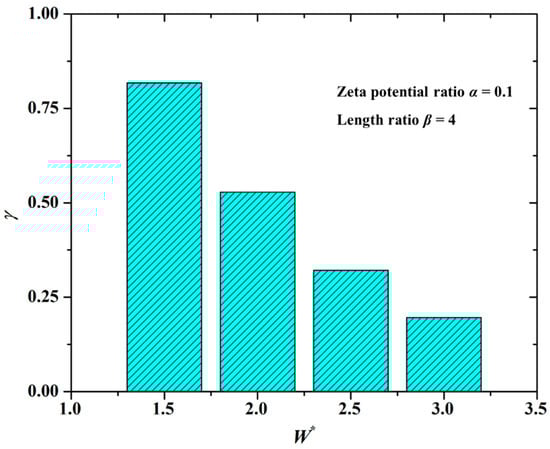 The channel width greatly affects the mixing performance of the solute, as shown in Figure 5 under the conditions of the zeta potential ratio α = 0.1 and the length ratio β = 4. From Figure 5 it is found that the mixing index (γ) is smaller under the larger dimensionless value of the channel width (W*). In other words, the mixing performance is better in the microchannel with a smaller channel width. The explanation is as follows.