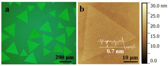Figure 1a shows the optical image of the as-grown triangle WS2 flakes on SiO2/Si substrate; the majority of the flakes were more than 220 μm. The thickness of these triangle crystals was measured by atomic force microscopy (AFM) (Figure 1b). The AFM step height of the WS2 flake was typically measured at 0.7 nm, which corresponds to a one-layer structure.