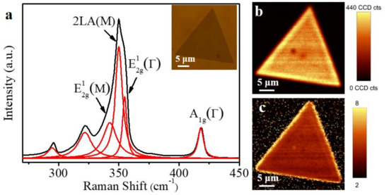 (a) Raman characterization of the monolayer WS2 triangle flake with 532 nm excitation wavelengths. (b) A1g(Γ) intensity mapping for the WS2 triangle flake. (c) Intensity ratio mapping of 2LA(M) over A1g(Γ) for the WS2 triangle flake.
