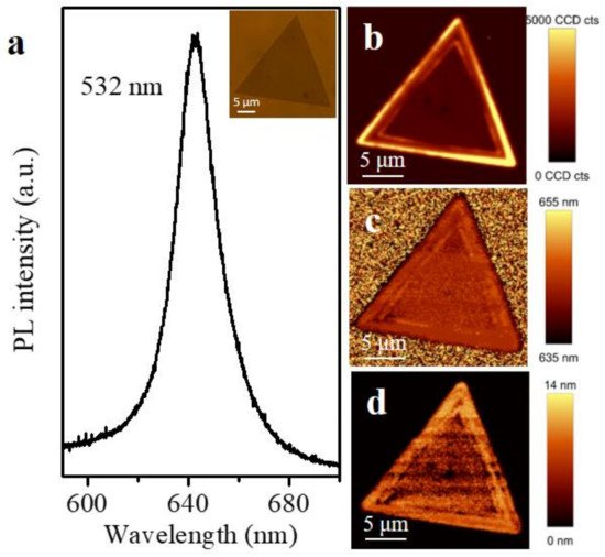 (a) PL spectra of the monolayer WS2 triangle flake. (b–d) PL images of the peak integrated intensity, position, and width, respectively.