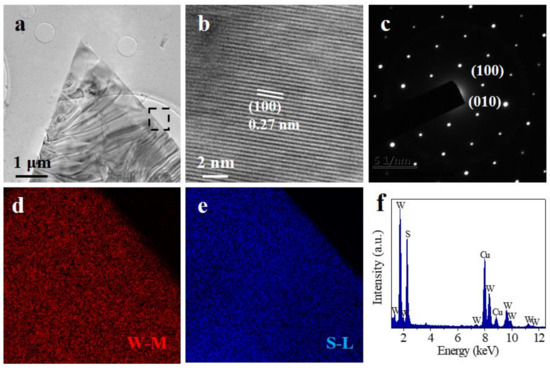 (a) Low-magnification TEM image of the WS2 triangle flake. (b) High-resolution TEM image and (c) SAED pattern image of the WS2 triangle flake. (d,e) W and S elemental mapping in the black rectangle region of the WS2 flake in (a,f) EDX spectrum of the WS2 flake.