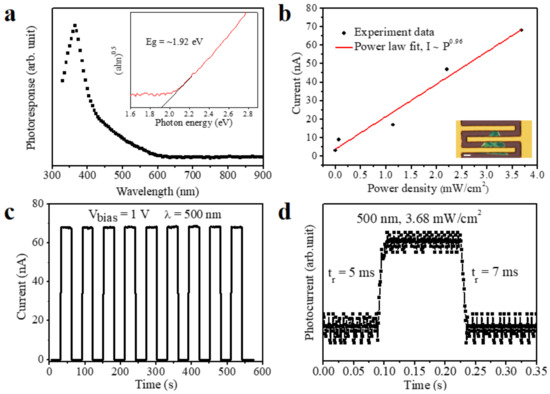 To research the optoelectronic properties of the WS2 flakes, photodetectors based on them were fabricated. The spectral response curve reaches a minimum at the wavelength of ≈645 nm in Figure 5a. Hence, the bandgap is about 1.92 eV by calculation, which is consistent with the PL results. Fitting the plot of photocurrent Iph on light intensity P for the WS2 flake as Iph ≈ Pθ obtains the value of θ ≈ 0.96 (Figure 5b), hinting the as-grown WS2 has very few defects or traps to photo-induced electron/hole pairs in the test power density range [42]. We further tested the cyclability of the photodetector under 500 nm incident light with the light on/off time interval of 30 s under a bias of 1 V (Figure 5c). The performances of the photodetector are stable. The response and recovery rates were 5 ms and 7 ms tested by an oscilloscope, respectively (Figure 5d). The photoresponsivity was 7.3 A W−1, according to the Rλ = Iph/PS, where Iph is the photoexcited current, P is the light power intensity, and S is the effective area of the photodetector. The external quantum efficiency (EQE) was 1814%, according to the EQE = hcRλ/eλ, where h is the Plank’s constant, c is the light velocity, Rλ is the photoresponsivity, e is the elementary electronic charge, and λ is the exciting wavelength. The specific detectivity (D*) was 3.4 × 1012 Jones, according to the D* = RλS 1/2/(2eI dark)1/2, where I dark is the dark current. The performance of our photodetector is more inspiring than the most reported WS2 based photodetectors shown in Table 1.