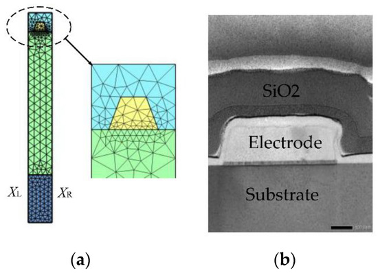 The single-finger SAW devices structure with trapezoid shape electrode, (a) 2D-FEM model, (b) cross-sectional scanning electron microscopy image of the actual device.